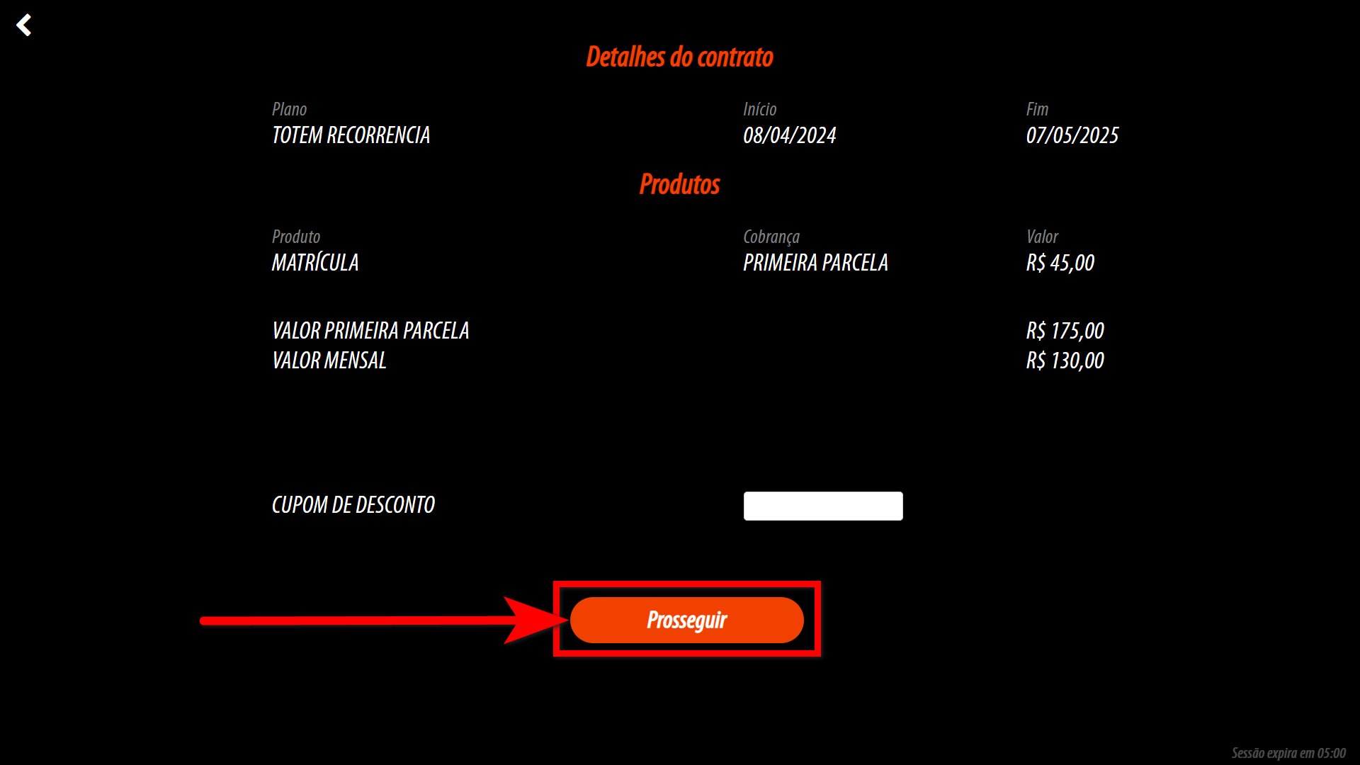 3. Será apresentada a tela de "Detalhes do contrato" onde pode adicionar um "Cupom de desconto" caso tiver. Clique em "Prosseguir";