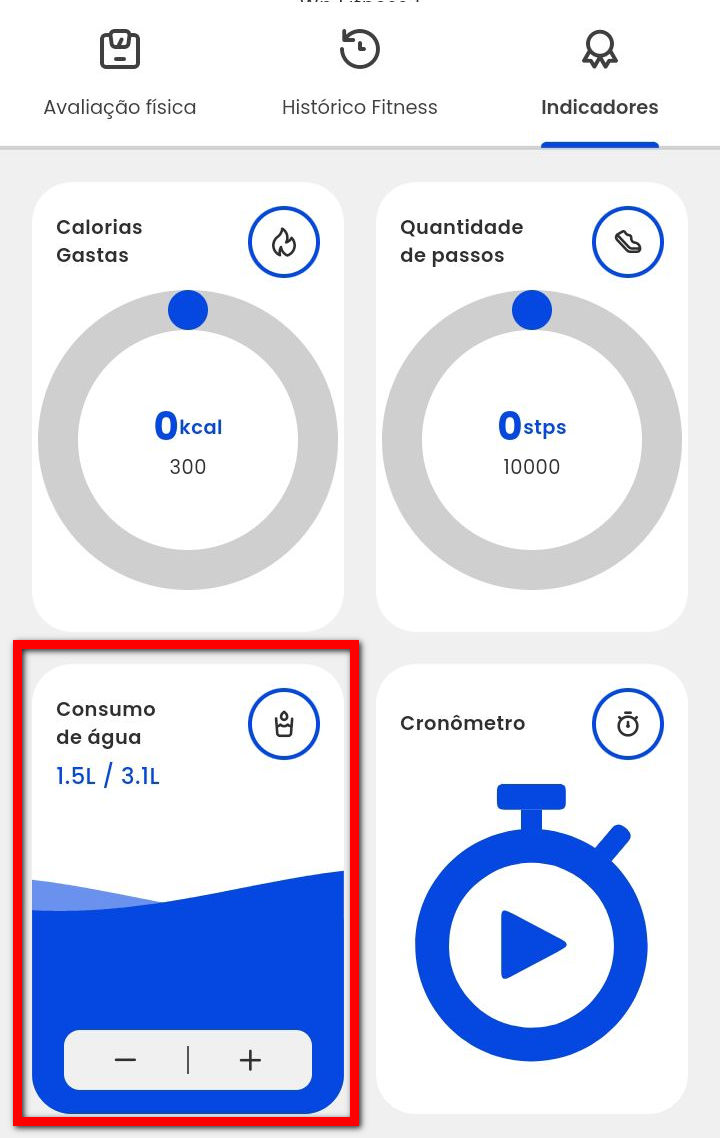 Neste indicador, o cliente pode facilmente monitorar o seu consumo diário de água ao mesmo tempo em que define o seu objetivo de consumo diário, permitindo-lhe registrar e acompanhar o seu progresso eficientemente.