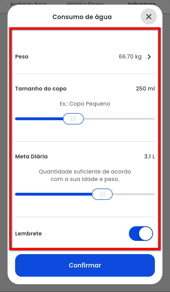 2. Na tela, o aluno pode configurar o "Peso" atual, o "Tamanho do Copo" em ml e a "Meta Diária" de consumo, além de habilitar um lembrete correspondente a esse indicador. Por fim clicar em "Confirmar".