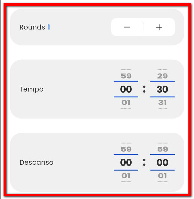 1.3. Neste bloco o cliente pode definir a quantidade de rounds que terá a atividade, o tempo de duração de cada round e por último o tempo de descanso.