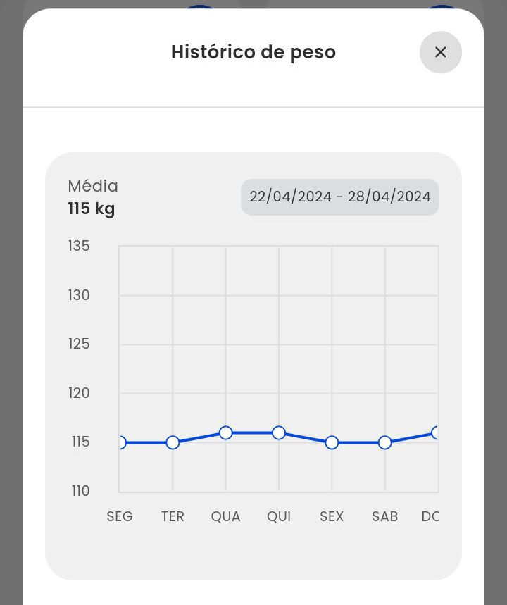 Neste indicador o cliente pode definir seu peso atual e, ao clicar sobre o indicador, acessar o histórico de peso através do gráfico “Histórico de peso“ além de verificar como está sua progressão.