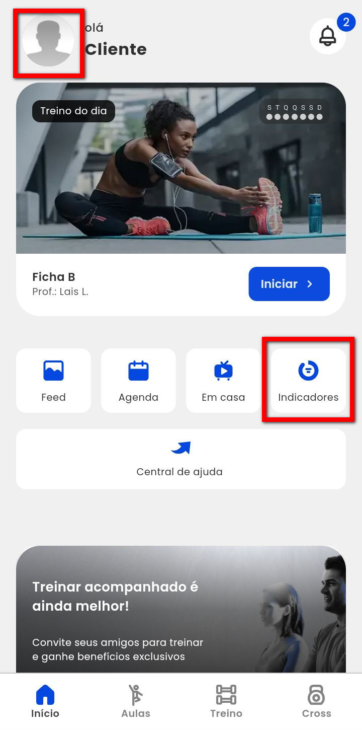 2. Para acessar os "Indicadores" ele pode clicar na foto de perfil, ou pode clicar no botão "Indicadores" na tela inicial;