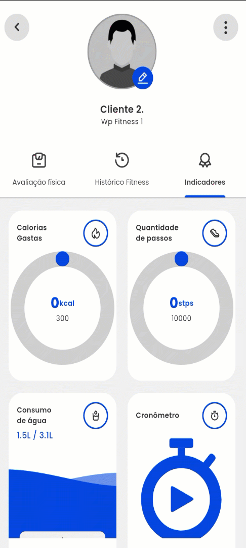 Observação: caso o aluno não tenha o aplicativo de saúde habilitado, as informações nos indicadores "Quantidade de passos" e "Calorias gastas" não serão apresentadas.