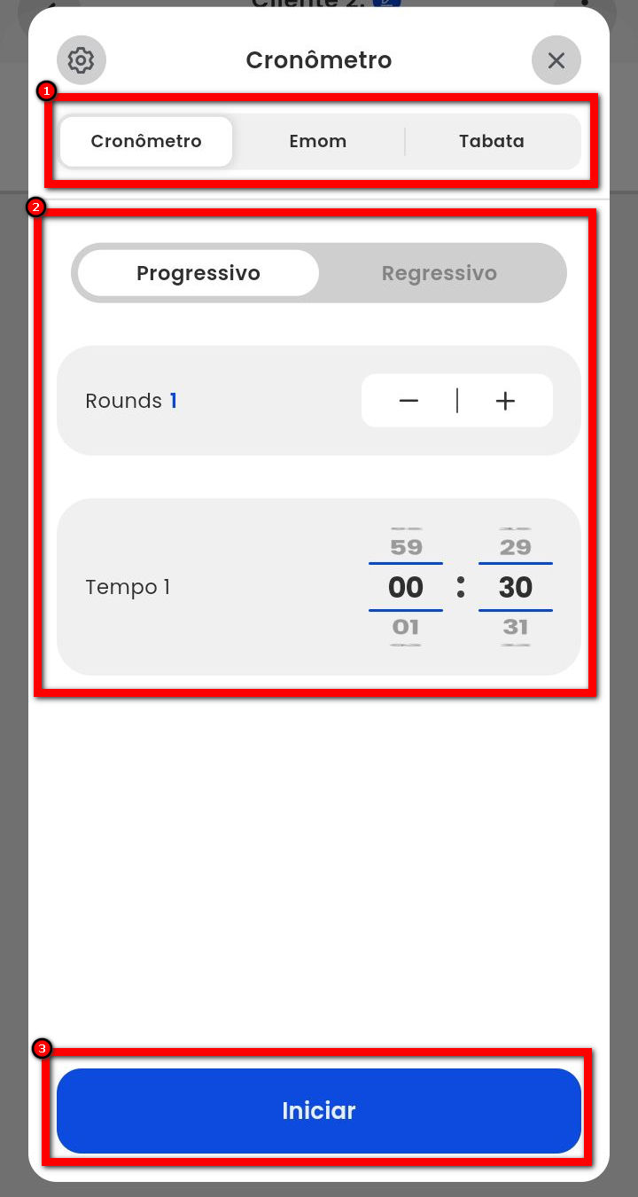 1. Na tela o cliente pode escolher quais dos três medidores irá utilizar, durante a execução da atividade, além de definir o tipo de contagem progressiva ou regressiva. Por fim, deve clicar em "Iniciar" para utilizar o medidor.