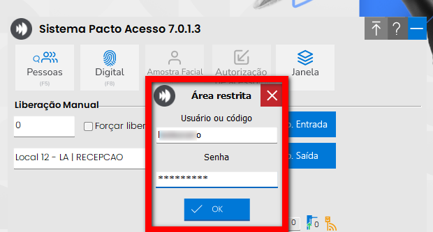 4. Informe seu usuário/código e senha e clique em "Ok"; Observação: o usuário e senha é o mesmo que você utiliza para logar no sistema Pacto.
