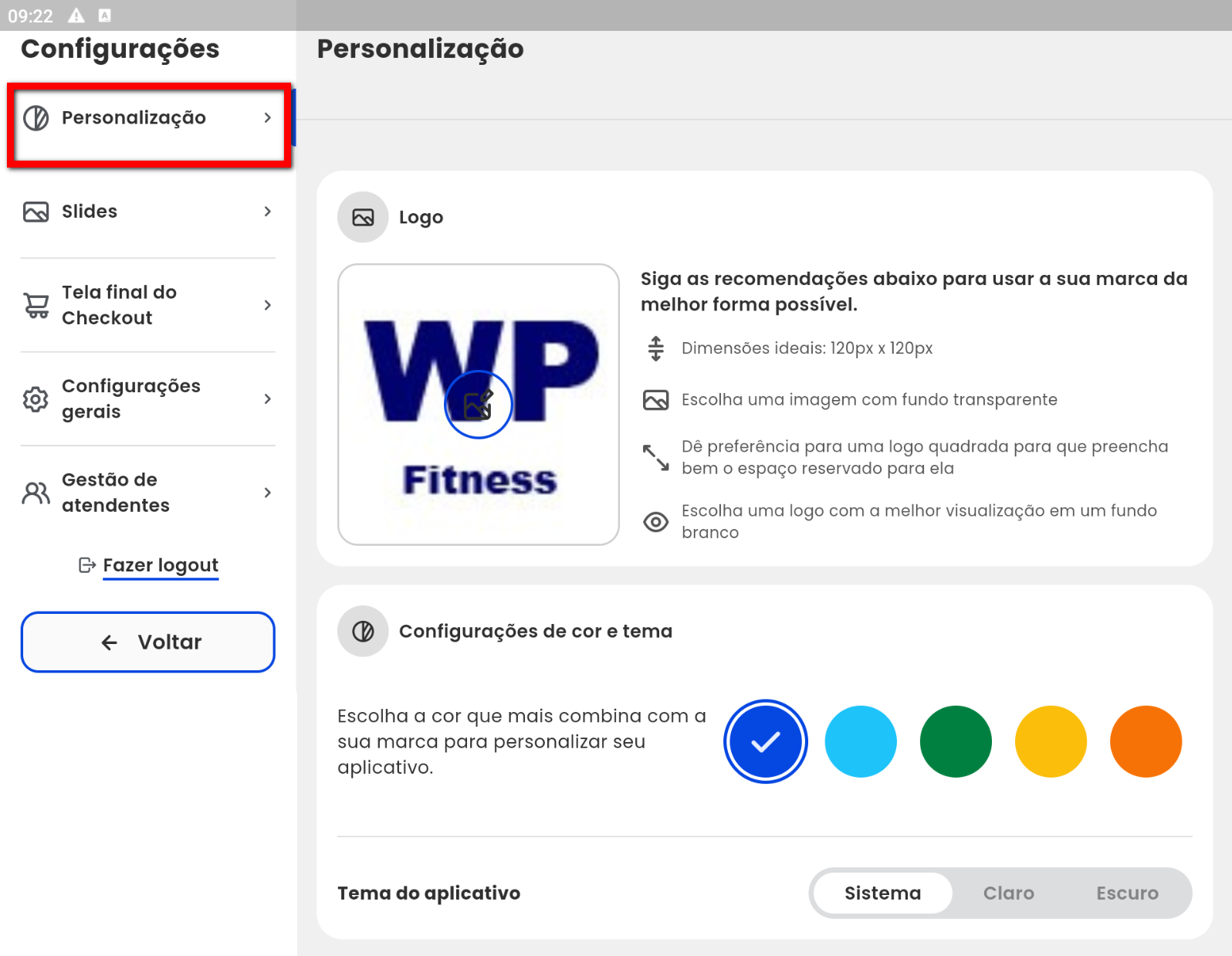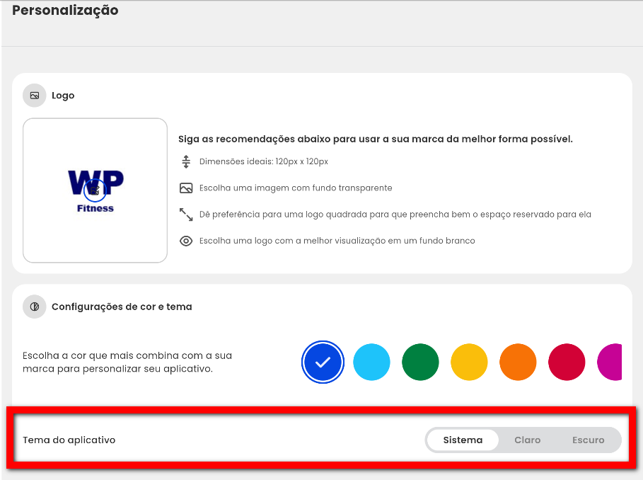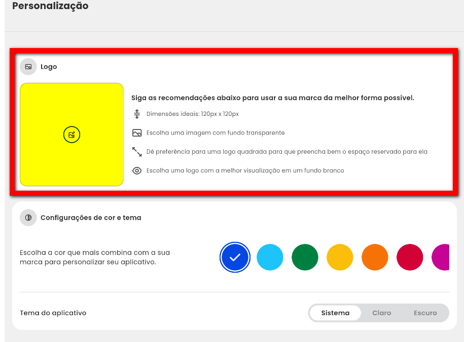 2.2. Em "Configurações de cor e tema" escolha a cor que mais combina com a sua marca. Clique sobre a cor desejada para personalizar o seu aplicativo;