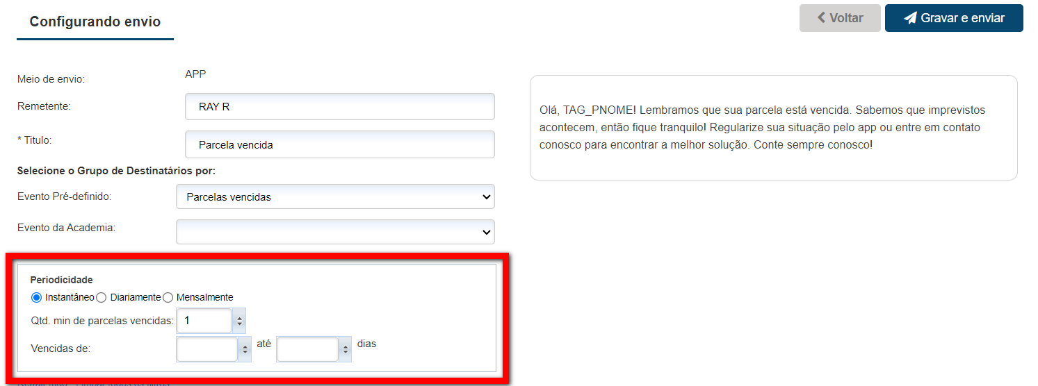Instantâneo: o sistema enviará o e-mail apenas uma única vez, a partir do momento que clicar em “Gravar e enviar“;
