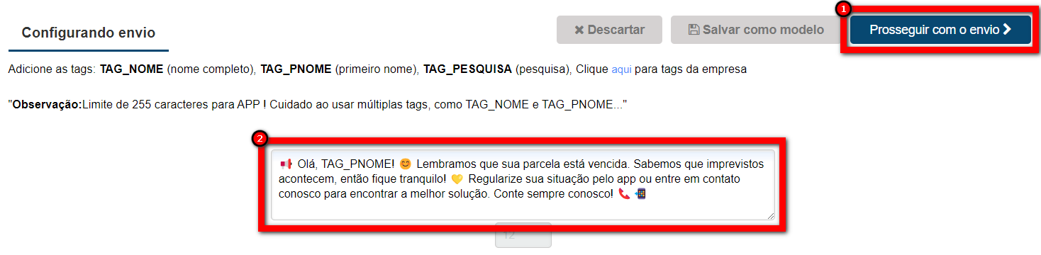 3. Escreva o texto e clique em “Prosseguir com o envio“;