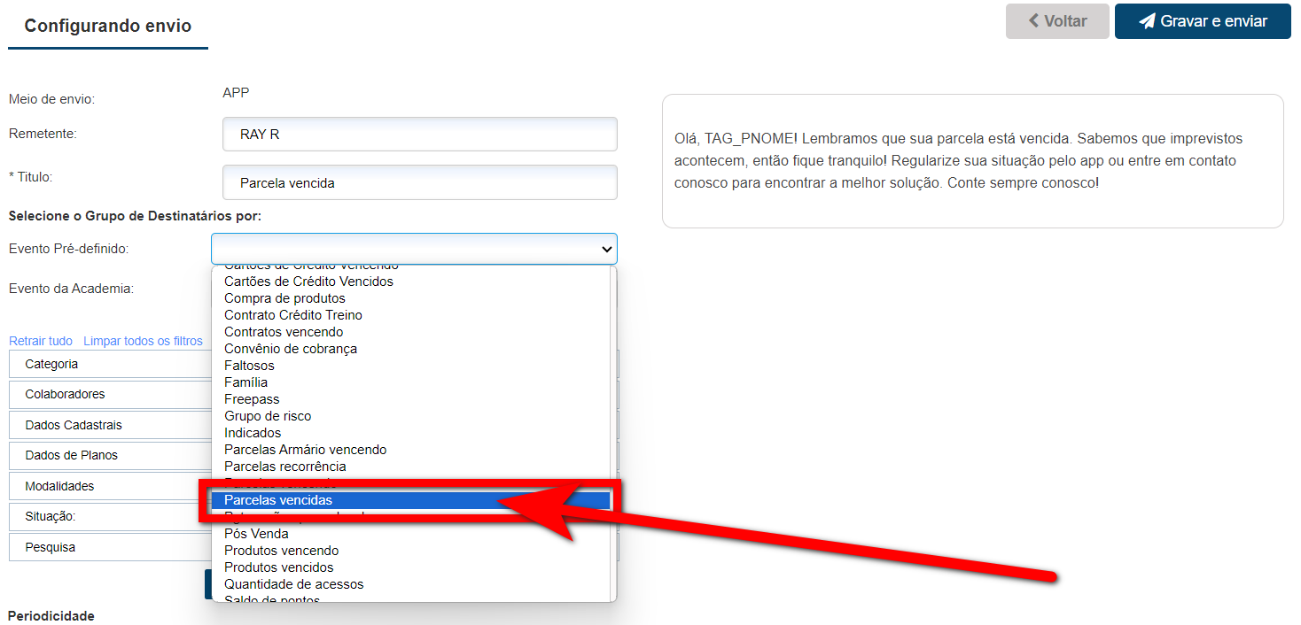 5. No campo “Evento Pré-definido” selecione a opção “Parcela vencida“;