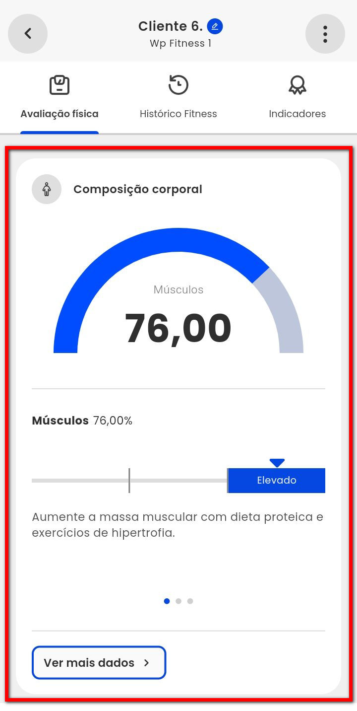 4.1. No indicador "Músculos" é apresentado a porcentagem muscular do aluno. Clicando em "Ver mais dados" o aluno consegue visualizar, em forma de gráfico, a sua evolução;