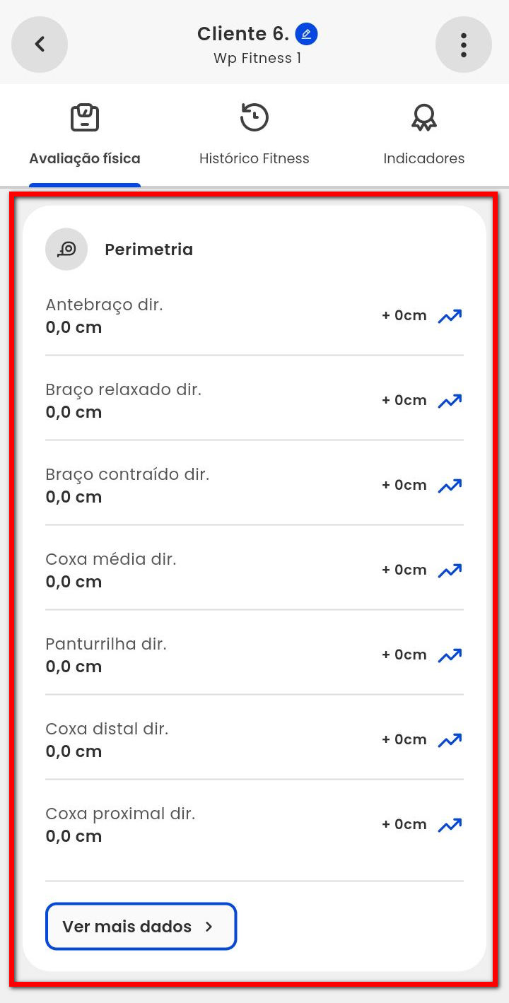 8. Em "Perimetria", serão apresentadas as medidas retiradas do aluno na avaliação física. Clicando em "Ver mais dados" consegue visualizar em forma de gráfico a evolução do aluno;