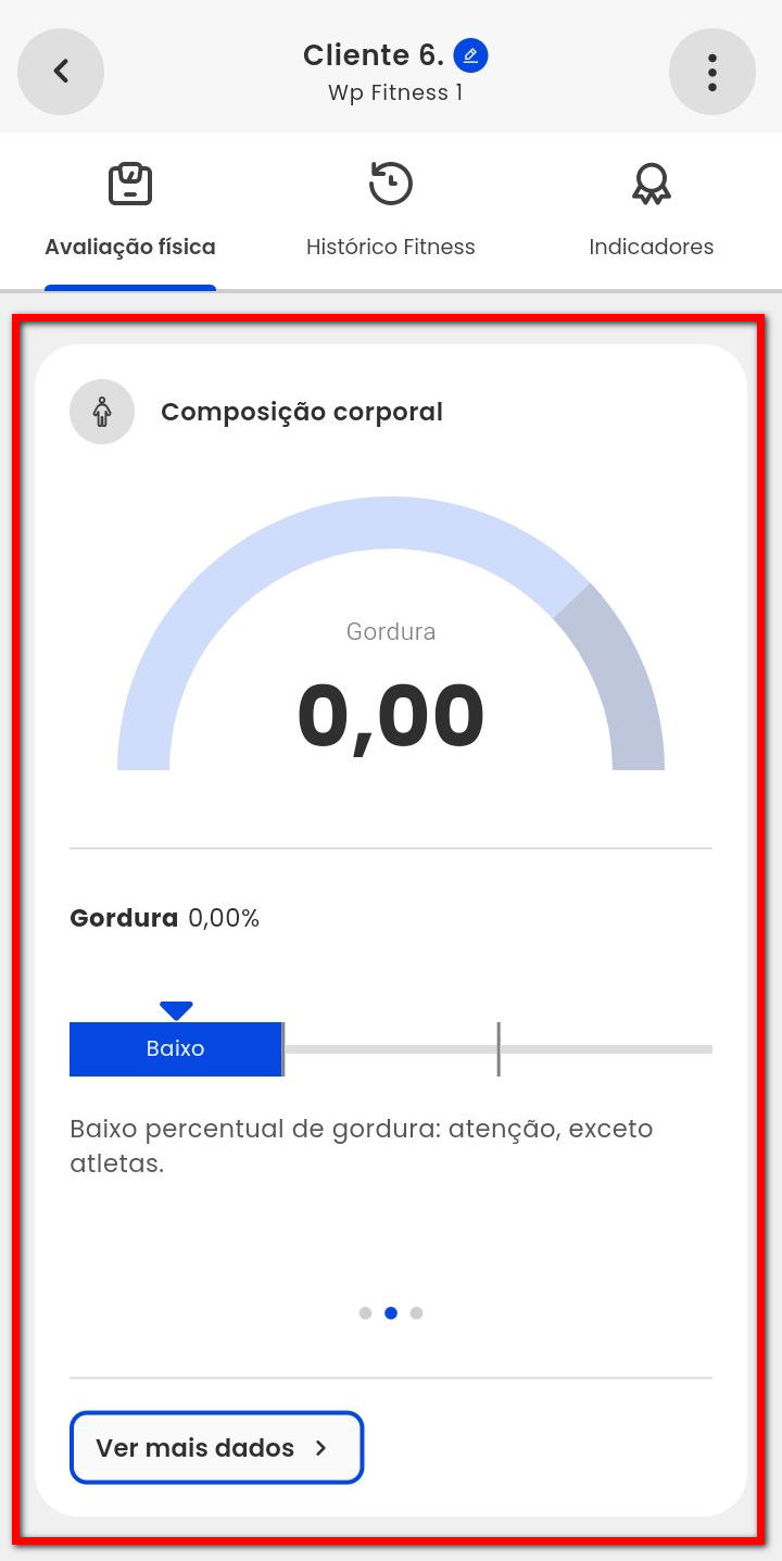 4.2. No indicador "Gordura", é apresentada a porcentagem de gordura corporal atual do aluno. Clicando em "Ver mais dados" o aluno consegue visualizar, em forma de gráfico, a sua evolução;