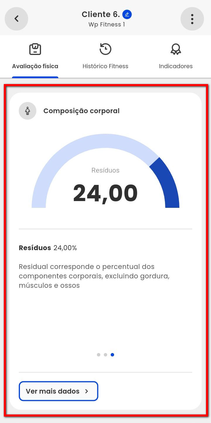 4.3. No indicador "Resíduos", é apresentado a porcentagem de resíduos corporais, excluindo gordura, músculos e ossos. Clicando em "Ver mais dados" o aluno consegue visualizar, em forma de gráfico, a sua evolução.