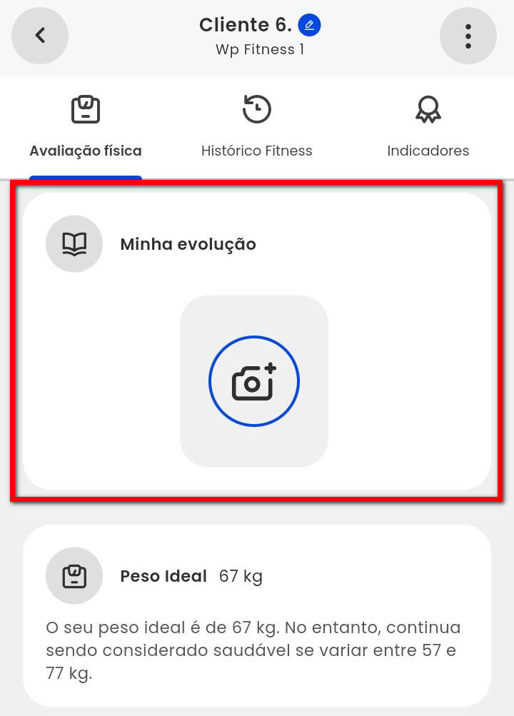 6. No bloco "Minha evolução" o aluno realiza a captura de fotos para comparar sua evolução de resultados;
