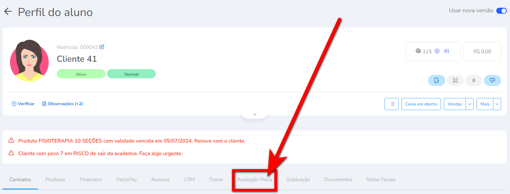 1. No perfil do aluno localize e clique na guia “Avaliação Física“;