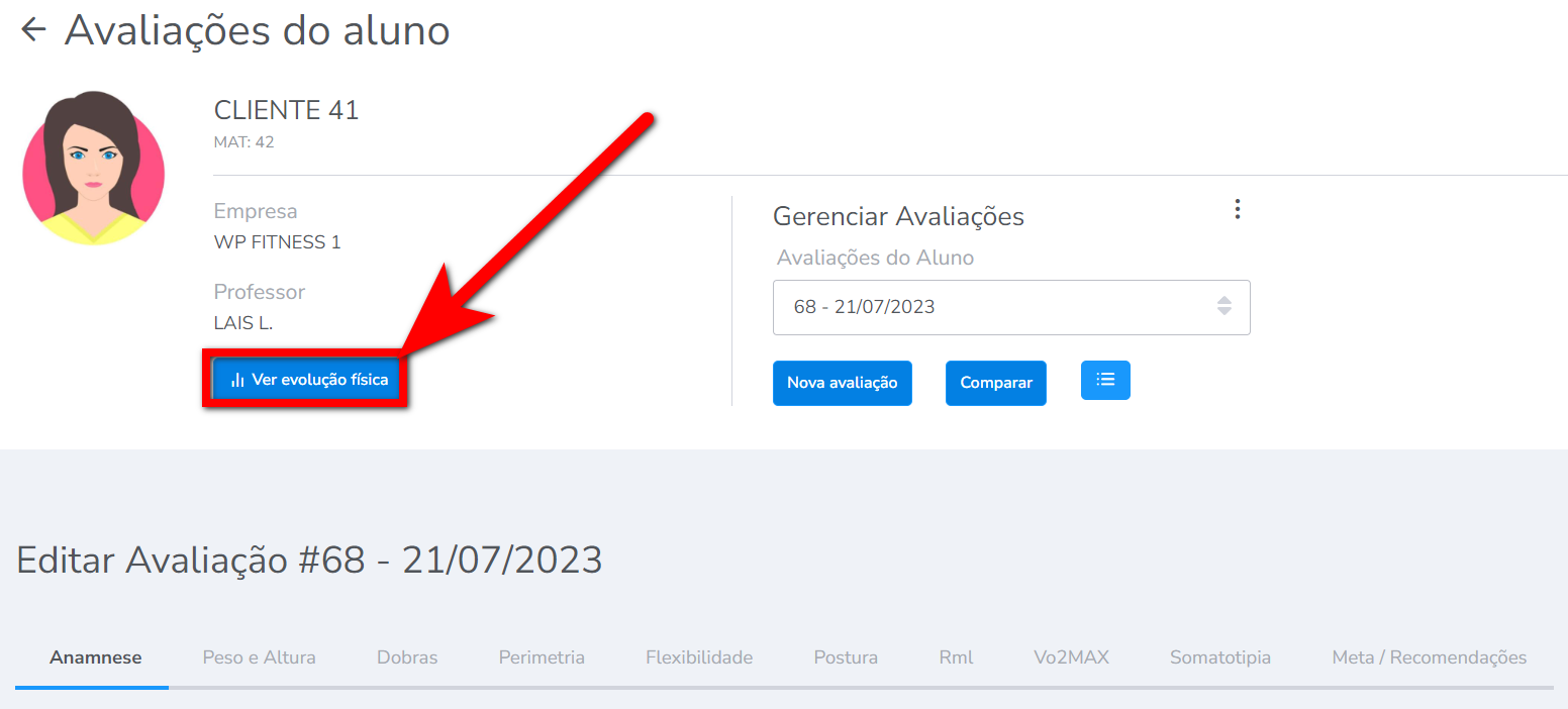 3. Será direcionado para a tela de edição da avaliação física. Localize e clique no botão “Ver evolução física“;