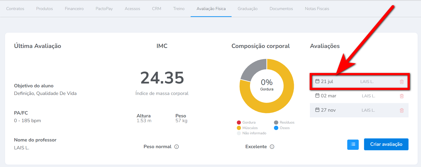 Para saber como lançar uma avaliação física para o aluno, clique aqui.