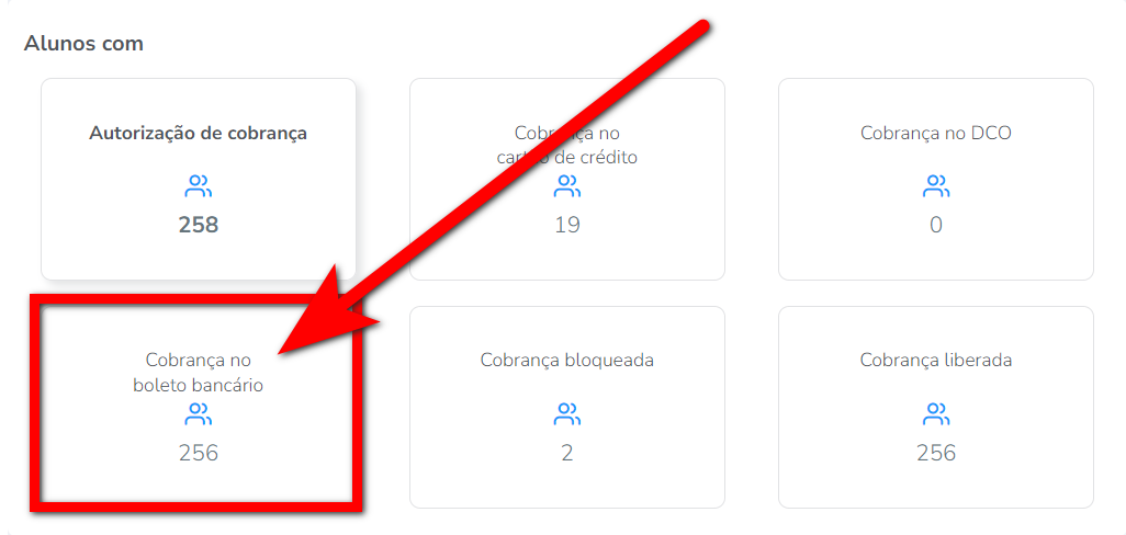 2. Localize o bloco de "Alunos com" e clique no indicador "Cobrança no Boleto Bancário";