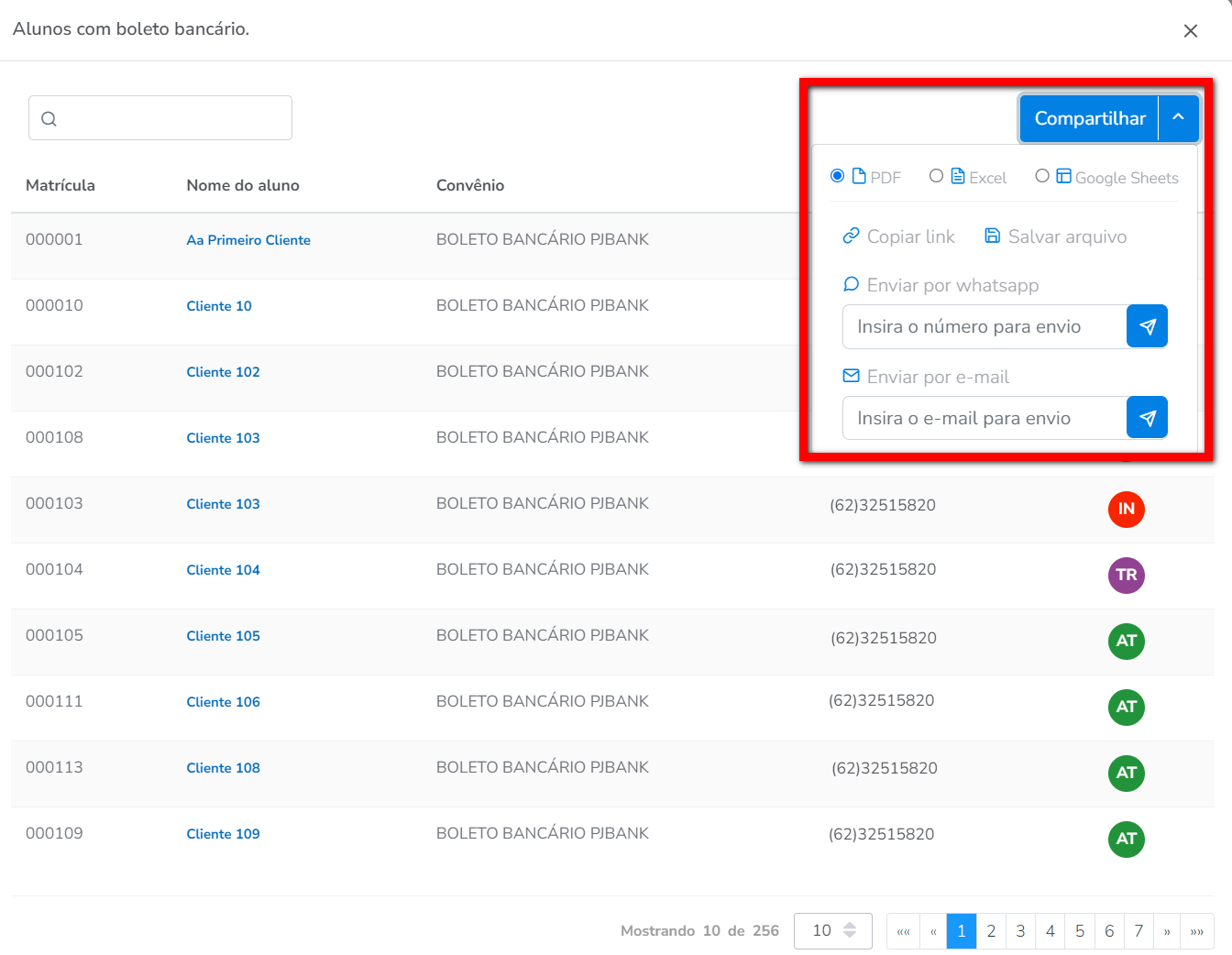 3. Logo será apresentada a tela contendo todos os "Alunos com boleto bancário";