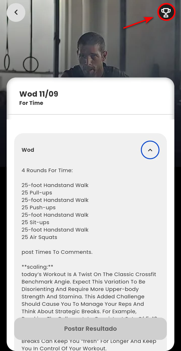 1. Na tela inicial do App, localize o WOD realizado, e clique sobre ele, para prosseguir;