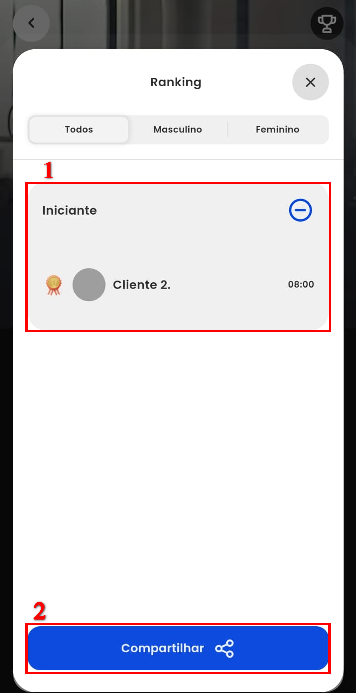 4. O App abrirá a tela de compartilhamento de ranking, onde você poderá visualizar sua posição, no quadro 1. Logo abaixo, no quadro 2, estará a opção para compartilhar seu resultado com quem desejar;
