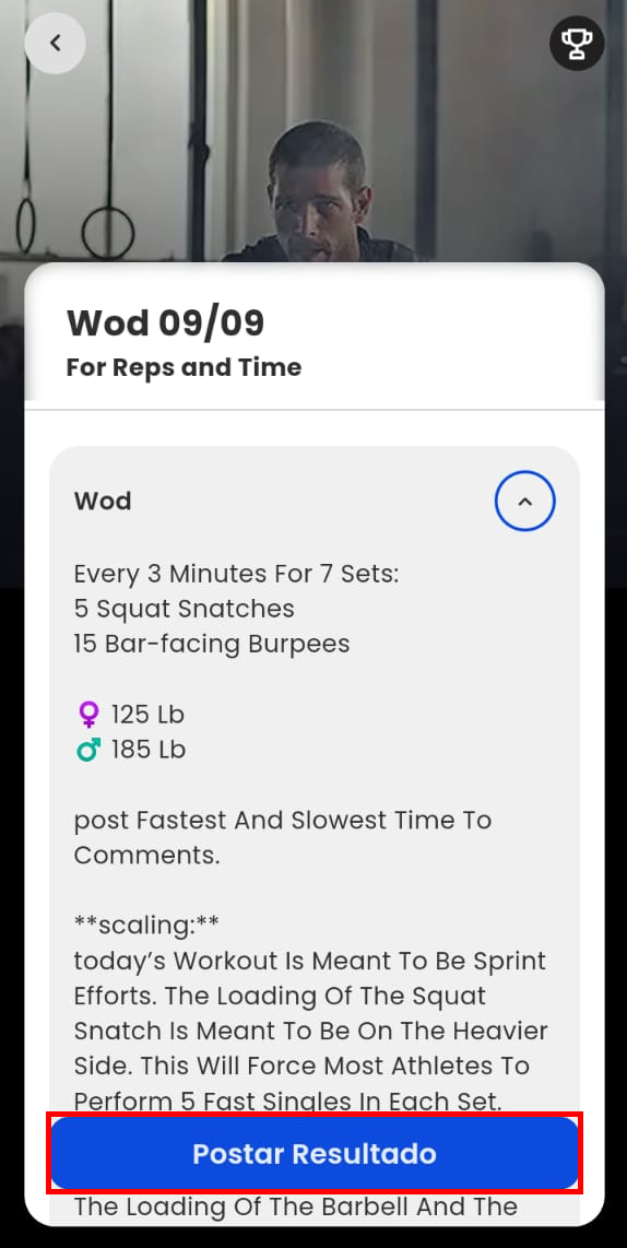 2. Em seguida, o App mostrará o detalhamento completo do WOD. Depois disso, é só clicar em "Postar resultado" para avançar e compartilhar;