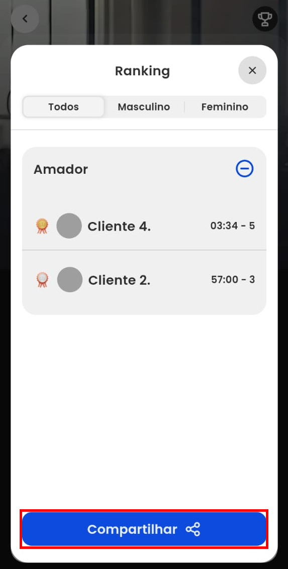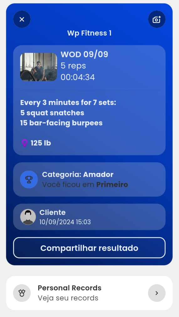 7. Por fim, você será direcionado para a tela do ranking, onde poderá ver em detalhes o WOD que acabou de realizar. E tem mais, além de visualizar seu resultado, você pode compartilhar e conferir seu Personal Records.
