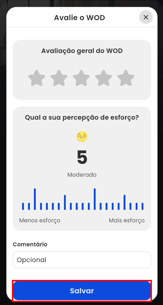 5. Aqui, é o momento de avaliar o WOD. Dê uma nota de 1 a 5 estrelas, informe sua percepção sobre o esforço necessário para concluir essa atividade e deixe seu comentário contando como foi a experiência. Depois, é só clicar em "Salvar";