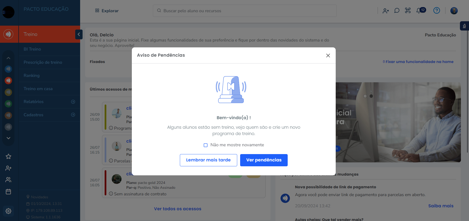1. Assim que o colaborador acessar a tela inicial do módulo Treino, o sistema exibirá um aviso de pendências se houver alunos com treino vencido ou sem treino em sua carteira;