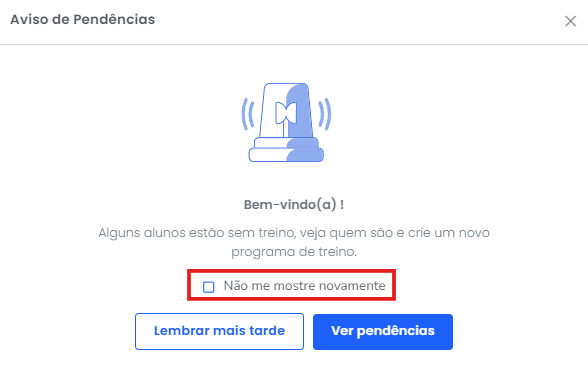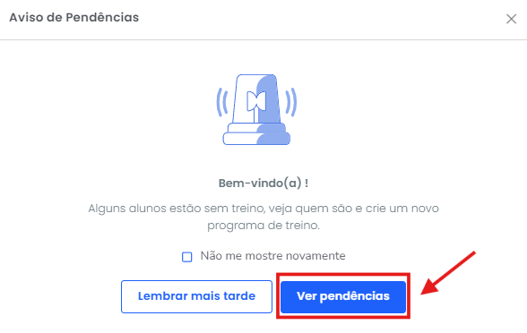 O colaborador, toda vez que acessar o módulo Treino, terá uma tela de notificação apresentada, caso existam alunos com pendências relacionadas ao programa de treino vinculados à sua carteira.