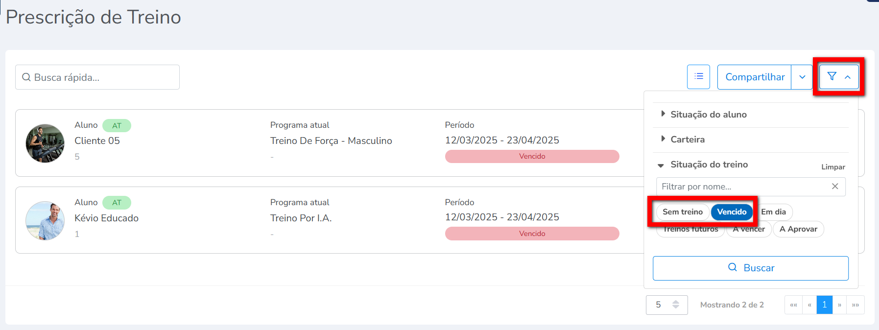 1.3.1. Na tela de prescrição de treino, o filtro rápido já vem preenchido com os status "Vencidos" e "Sem treino", permitindo visualizar todos os alunos que se encontram nessas condições. Além disso, você poderá renovar ou criar um novo programa de treino para esses alunos.