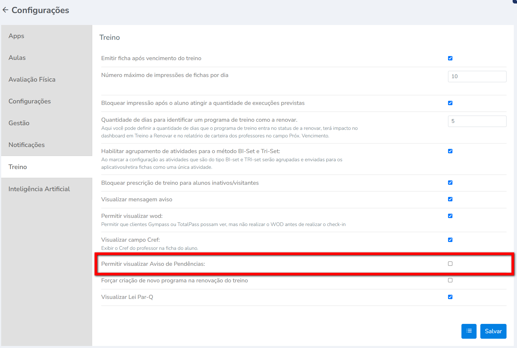 4. Marque a opção "Permitir visualizar Aviso de Pendências" e, em seguida, clique em "Salvar";