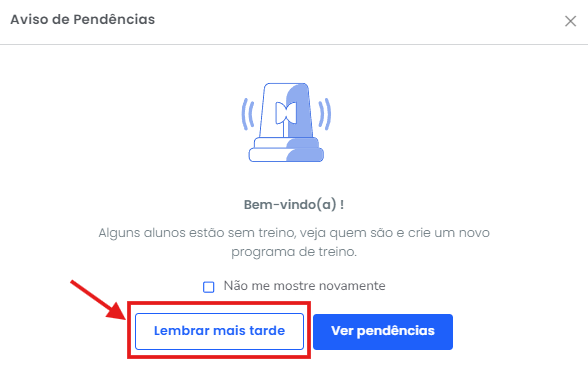 1.2. Se você marcar a caixa de seleção "Não me mostre novamente" o sistema não exibirá a notificação novamente ao abrir o módulo Treino;