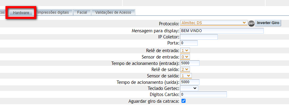 Protocolo: neste campo você terá que informar o nome do protocolo "Almitec DS" de comunicação entre a catraca e o sistema;