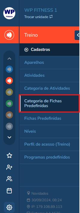 É necessário ter as permissões "Cadastros" e “Categoria Ficha” habilitadas no perfil de acesso no módulo Treino.
