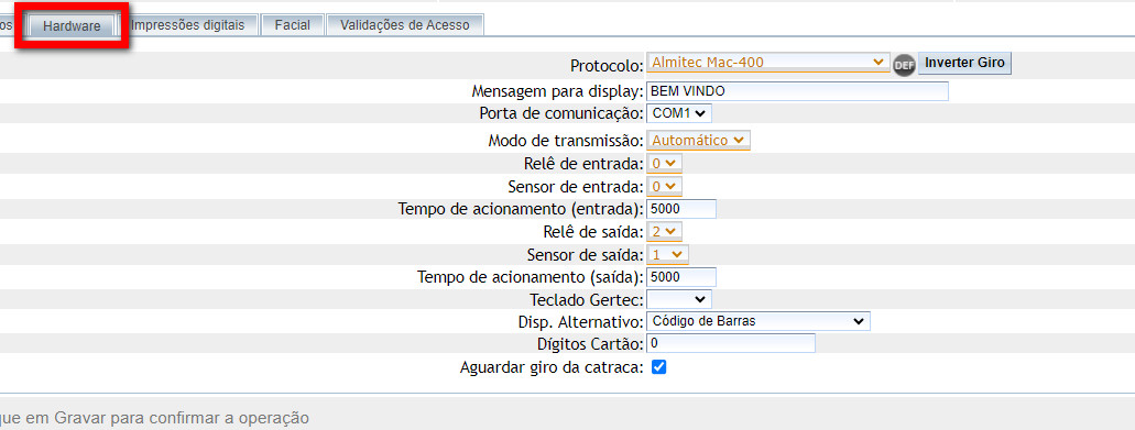 Protocolo: neste campo você terá que informar o nome do protocolo "Almitec MAC-400" de comunicação entre a catraca e o sistema;
