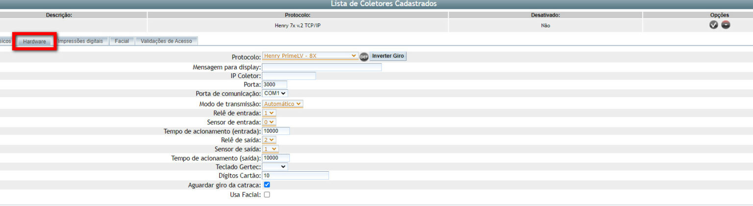 2.2. Na guia “Hardware“ selecione o Protocolo “Henry 8x PrimeLV - 8x“.