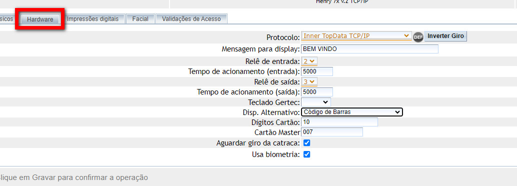 - Protocolo: selecione o modelo da catraca “Inner Topdata“;