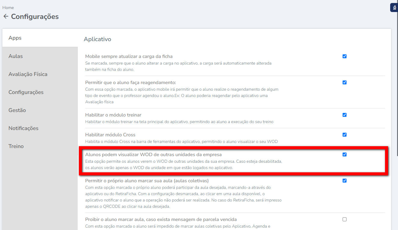 - Alunos podem visualizar WOD de outras unidades da empresa: com essa opção marcada, enviar para o aplicativo mostrar para o aluno todos os WOD cadastrados para o dia vigente. Caso esteja desmarcada, enviar apenas o WOD da unidade no qual o aluno estiver logado no app;