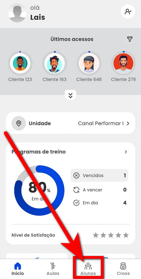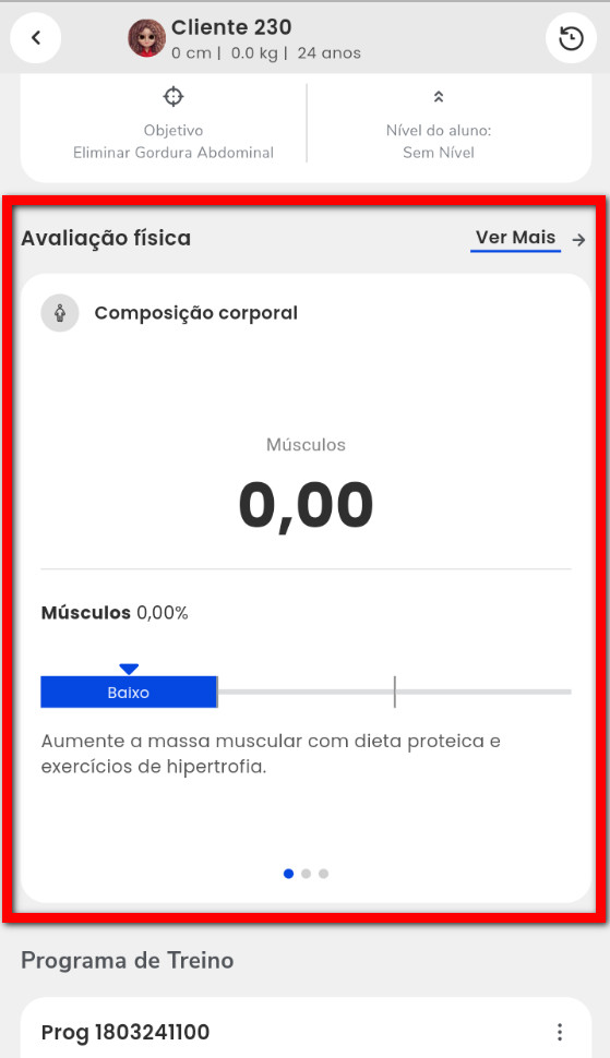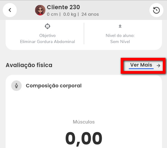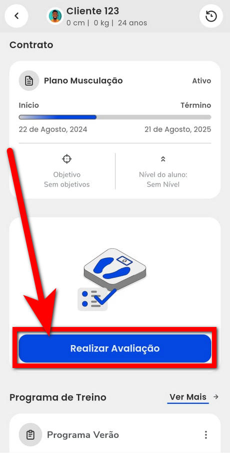 4. Após role para cima até o botão "Realizar Avaliação" caso seja a primeira avaliação física do cliente ou até o bloco "Avaliação física" caso seja a segunda avaliação física do cliente;