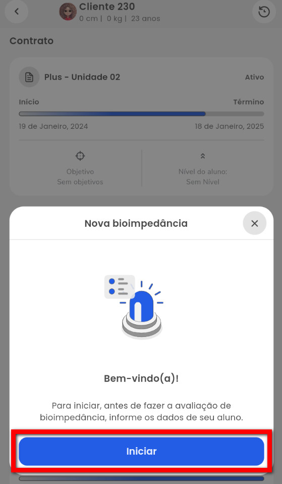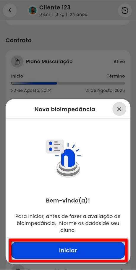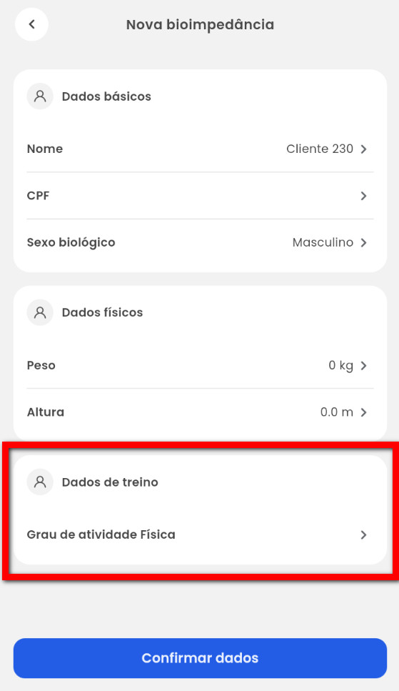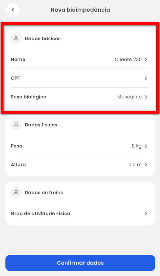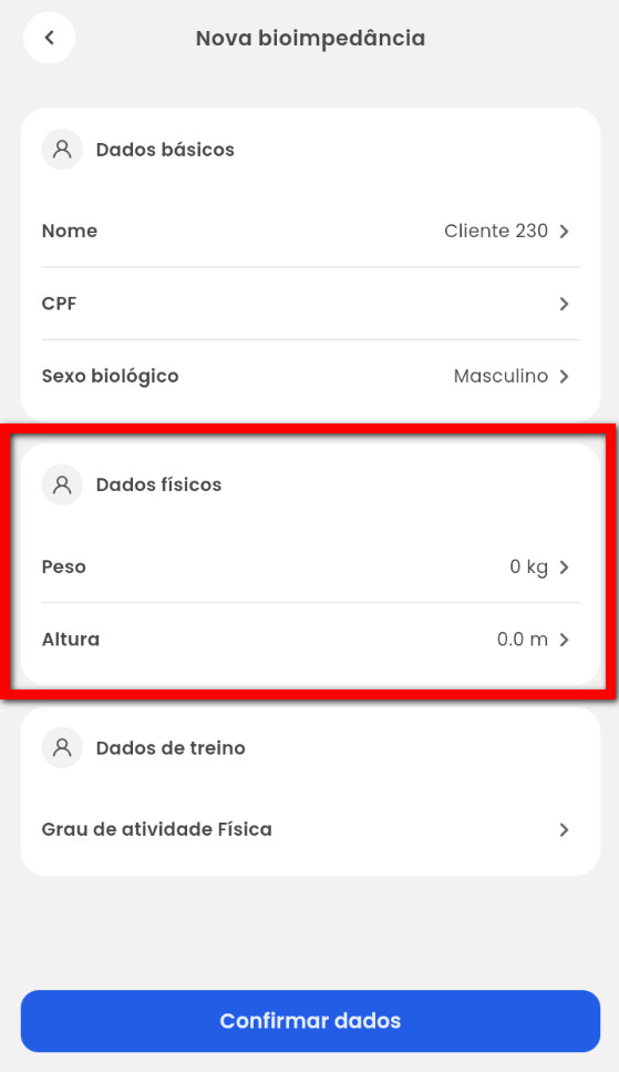 5. Na tela "Nova bioimpedância" confirme e preencha as informações do cliente;