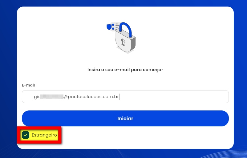 3.1. Caso o aluno seja estrangeiro (não tem CPF), marque a opção “Estrangeiro” para que o campo de e-mail seja exibido e o aluno possa realizar seu acesso.