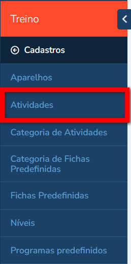 1. No menu lateral do módulo Treino clique em "Cadastros";