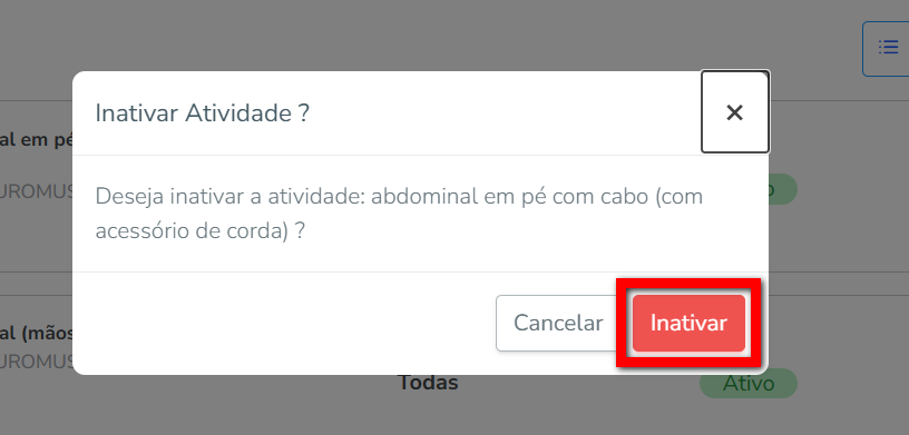 Em alguns casos é necessário inativar uma atividade, seja porque a empresa não tem aparelhos para ela ou não permite esse tipo de atividade na academia. Desta forma, inativando a atividade, a IA deixará de prescrever treinos com aquela atividade específica.