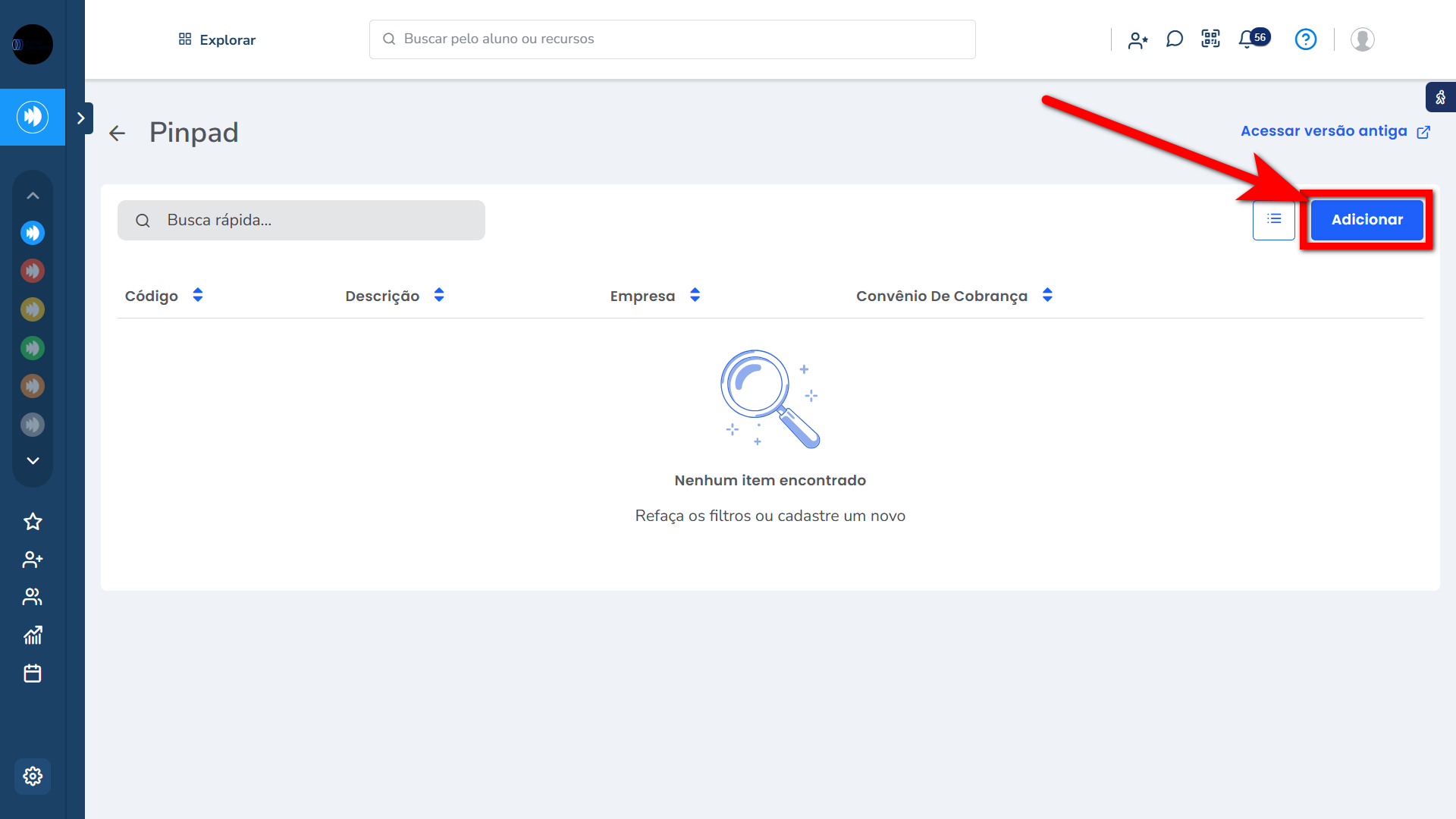 2. Será apresentado uma nova janela contendo todos os Pinpads cadastrados. Para cadastrar um novo clique em “Adicionar”;
