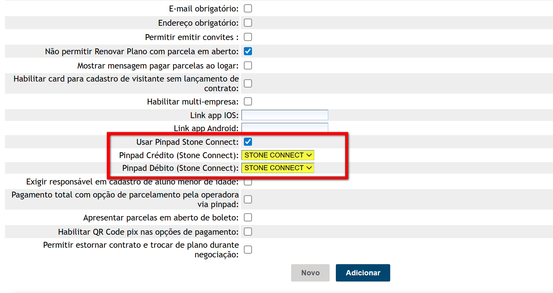 4. No bloco "Configurações de pinpad" no campo "Pinpad", selecione a opção "Stone Connect"