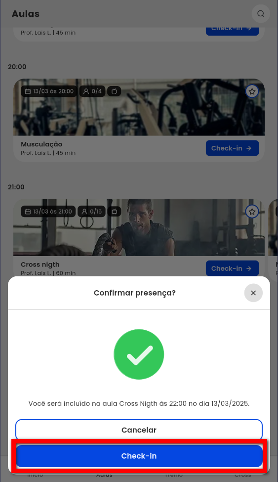 4. Será aberta a tela de confirmar presença. Clique em "Check-in";