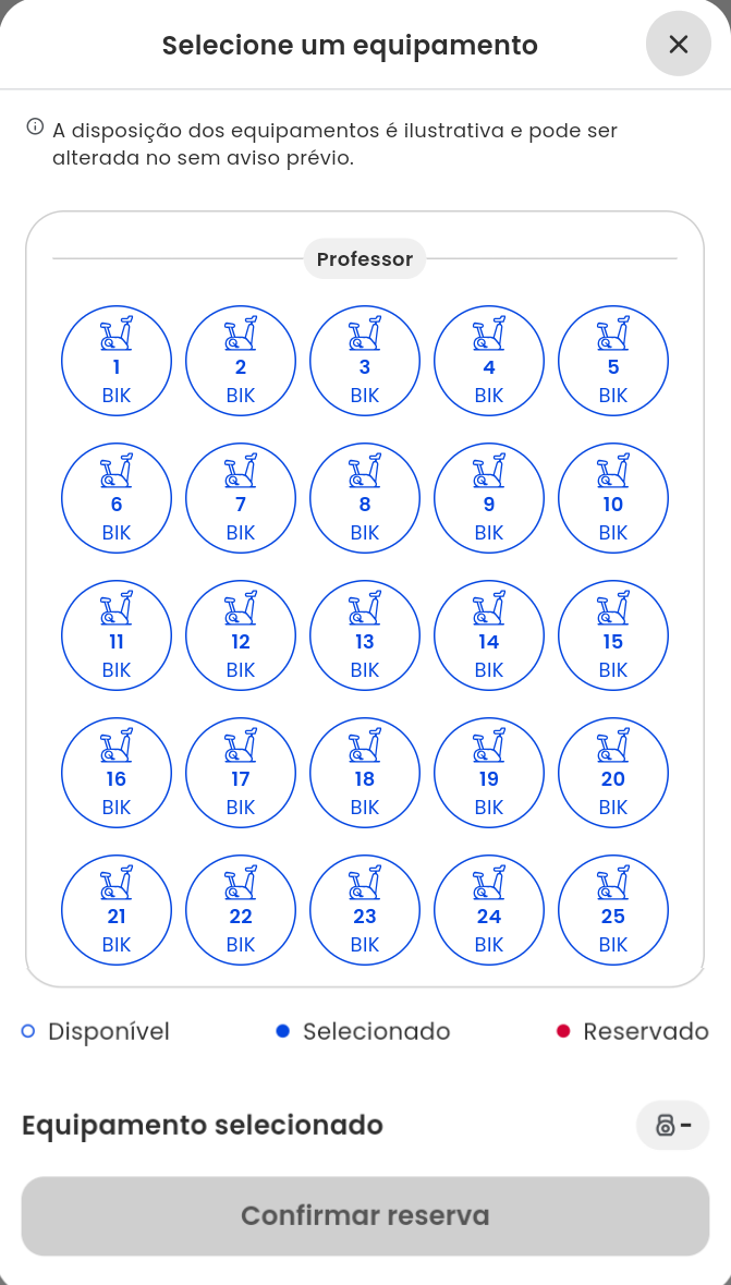 Exemplo: uma academia oferece aulas de Bike Indoor e disponibiliza o mapa de equipamentos para o aluno poder selecionar uma bicicleta específica, num local mais perto do professor e mais climatizado.