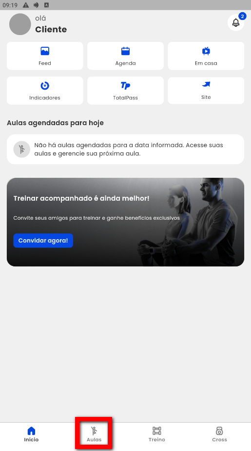 1. Na tela do aplicativo clique no menu "Aulas";