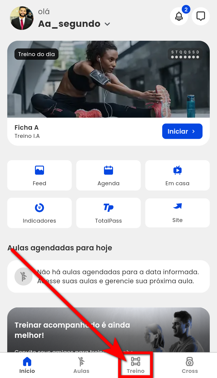 1. Após fazer login no App Treino, o aluno deve acessar o menu inferior e clicar no botão "Treino";